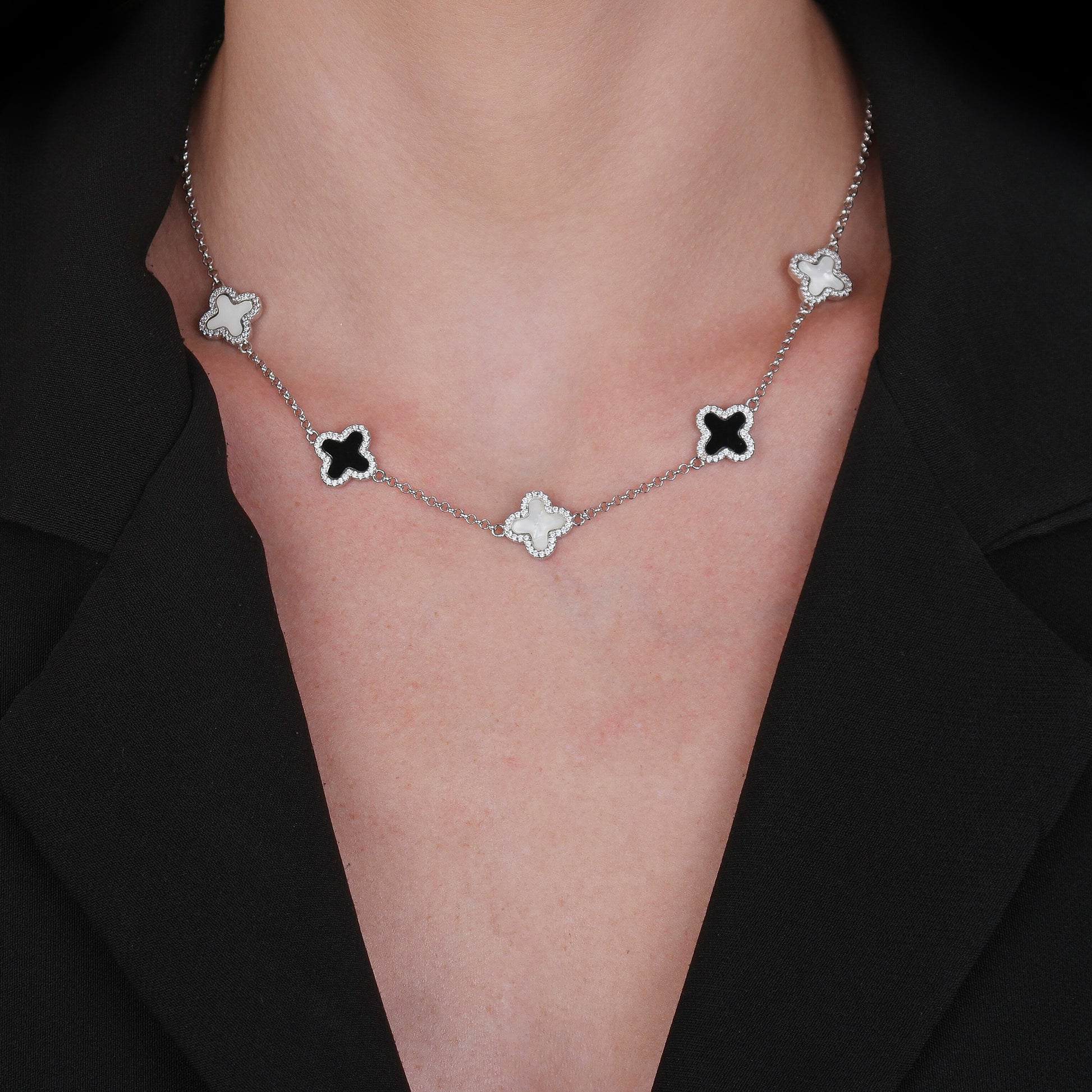 Colar Prateado de Trevos Pretos e Brancos Cravejados de Zircônia